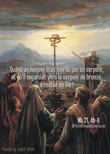 et le Seigneur dit à Moïse : « Fais-toi un serpent brûlant, et dresse-le au sommet d’un mât : tous ceux qui auront été mordus, qu’ils le regardent, alors ils vivront ! »