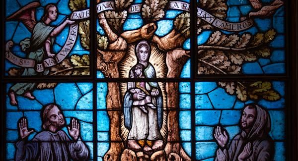 L’histoire, racontée des milliers de fois de génération en génération, assure que Nuño, le bandit repenti, fut rejoint dans sa prière par un prêtre. C’est à eux deux qu’un ange est apparu, révélant l’existence d’une statue de la Vierge cachée dans un arbre voisin. Nuño et le prêtre localisèrent la statue dans le creux taillé à l’intérieur du tronc d’un chêne, au milieu d’essaims d’abeilles et près d’une source d’eau cristalline. Là, à l’endroit où a été trouvée la statue, un autel fut érigé en l’honneur de la Vierge, qui avec le temps est devenu un petit oratoire.