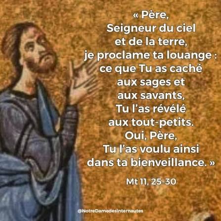 À l’heure même, Jésus exulta de joie sous l’action de l’Esprit Saint, et il dit : « Père, Seigneur du ciel et de la terre, je proclame ta louange : ce que tu as caché aux sages et aux savants, tu l’as révélé aux tout-petits. Oui, Père, tu l’as voulu ainsi dans ta bienveillance.