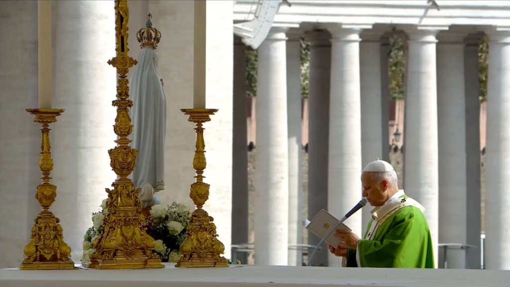 Le moment s’est produit avant la bénédiction finale. Le Saint-Père s’est approché de la sculpture de la Vierge de Fatima, présente sur l’autel de l’enceinte de la place Saint-Pierre, et a prononcé la prière de consécration. À la fin, il a été accompagné de l’Image, qui a brièvement joué, restant silencieux pendant de brefs instants, accompagné de l’assemblée de plus de 30 000 fidèles qui ont participé à la célébration.