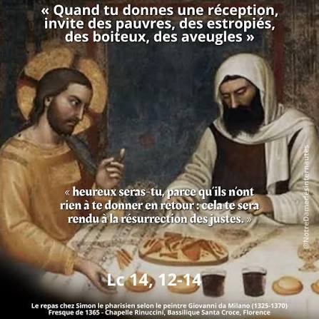 En ce temps-là, Jésus disait aussi à celui qui l’avait invité : « Quand tu donnes un déjeuner ou un dîner, n’invite pas tes amis, ni tes frères, ni tes parents, ni de riches voisins ; sinon, eux aussi te rendraient l’invitation et ce serait pour toi un don en retour.