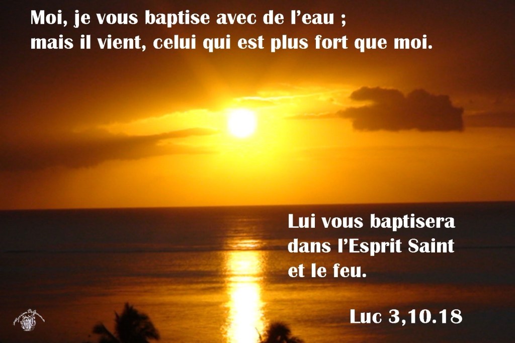 Moi, je vous baptise dans l’eau, en vue de la conversion. Mais celui qui vient derrière moi est plus fort que moi, et je ne suis pas digne de lui retirer ses sandales. Lui vous baptisera dans l’Esprit Saint et le feu.