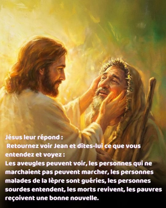 Les aveugles retrouvent la vue, et les boiteux marchent, les lépreux sont purifiés, et les sourds entendent, les morts ressuscitent, et les pauvres reçoivent la Bonne Nouvelle.