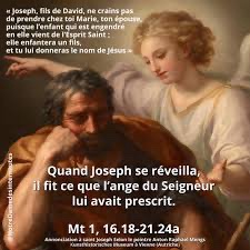 Comme il avait formé ce projet, voici que l’ange du Seigneur lui apparut en songe et lui dit : « Joseph, fils de David, ne crains pas de prendre chez toi Marie, ton épouse, puisque l’enfant qui est engendré en elle vient de l’Esprit Saint ;