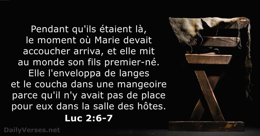 Et elle mit au monde son fils premier-né ; elle l’emmaillota et le coucha dans une mangeoire, car il n’y avait pas de place pour eux dans la salle commune.