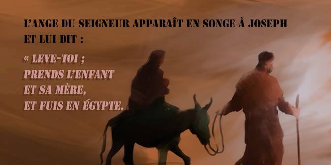 Après le départ des mages, voici que l’ange du Seigneur apparaît en songe à Joseph et lui dit : « Lève-toi ; prends l’enfant et sa mère, et fuis en Égypte. Reste là-bas jusqu’à ce que je t’avertisse, car Hérode va rechercher l’enfant pour le faire périr. »