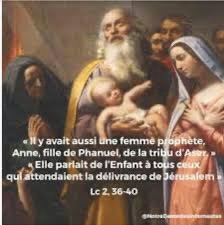 En ce temps-là, quand les parents de Jésus vinrent le présenter au Temple, il y avait aussi une femme prophète, Anne, fille de Phanuel, de la tribu d’Aser. Elle était très avancée en âge ; après sept ans de mariage,