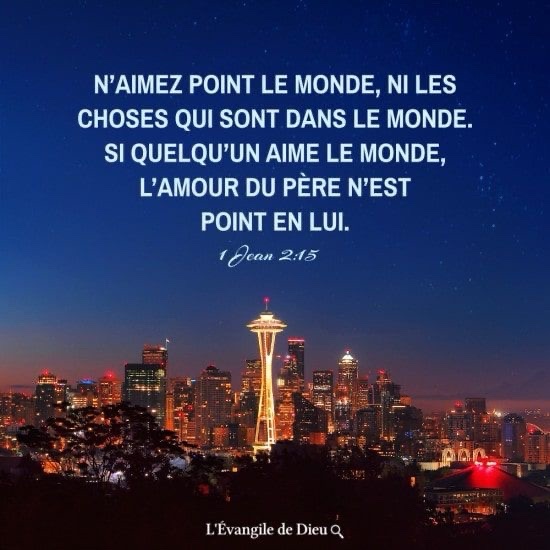 N’aimez pas le monde, ni ce qui est dans le monde. Si quelqu’un aime le monde, l’amour du Père n’est pas en lui.
