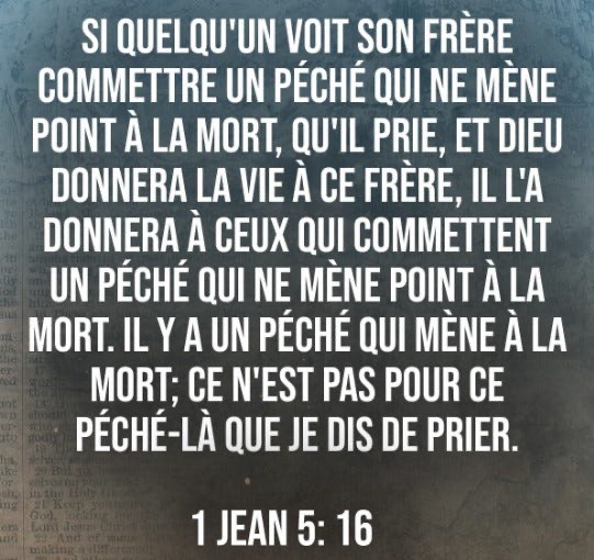 Si quelqu’un voit son frère commettre un péché qui n’entraîne pas la mort, il demandera, et Dieu lui donnera la vie, – cela vaut pour ceux dont le péché n’entraîne pas la mort. Il y a un péché qui entraîne la mort, ce n’est pas pour celui-là que je dis de prier.