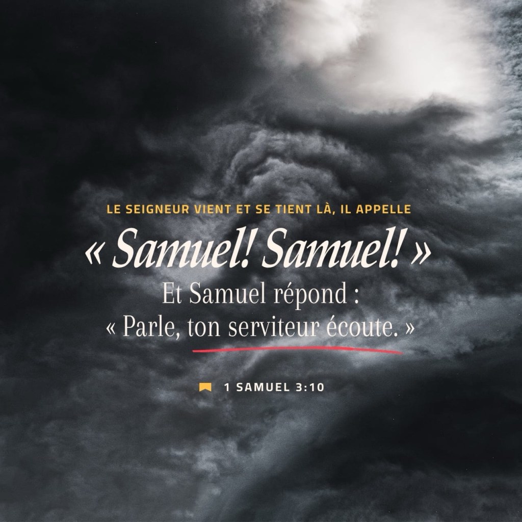 De nouveau, le Seigneur appela Samuel. Celui-ci se leva. Il alla auprès d’Éli, et il dit : « Tu m’as appelé, me voici. » Alors Éli comprit que c’était le Seigneur qui appelait l’enfant,
