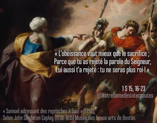 Samuel répliqua : « Le Seigneur aime-t-il les holocaustes et les sacrifices autant que l’obéissance à sa parole ? Oui, l’obéissance vaut mieux que le sacrifice, la docilité vaut mieux que la graisse des béliers.