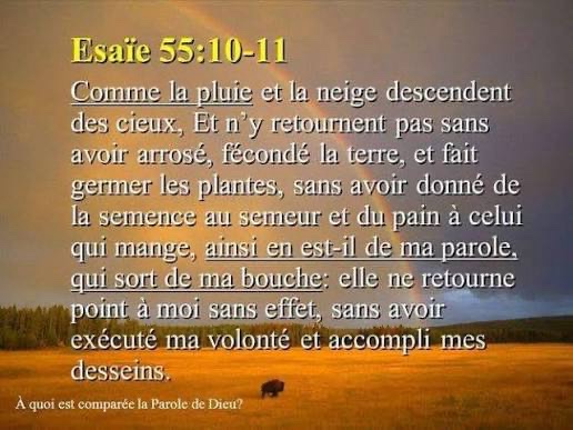 ainsi ma parole, qui sort de ma bouche, ne me reviendra pas sans résultat, sans avoir fait ce qui me plaît, sans avoir accompli sa mission. »