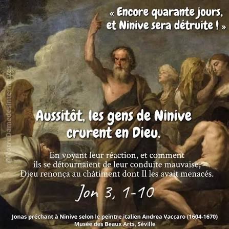 Aussitôt, les gens de Ninive crurent en Dieu. Ils annoncèrent un jeûne, et tous, du plus grand au plus petit, se vêtirent de toile à sac.