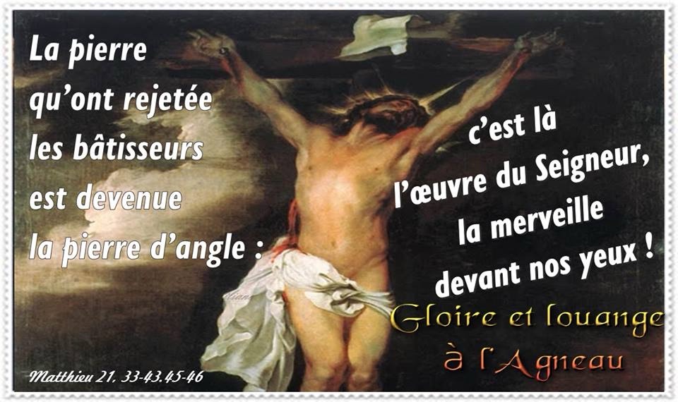 Jésus leur dit : « N’avez-vous jamais lu dans les Écritures : ‘La pierre qu’ont rejetée les bâtisseurs est devenue la pierre d’angle : c’est là l’œuvre du Seigneur, la merveille devant nos yeux !’