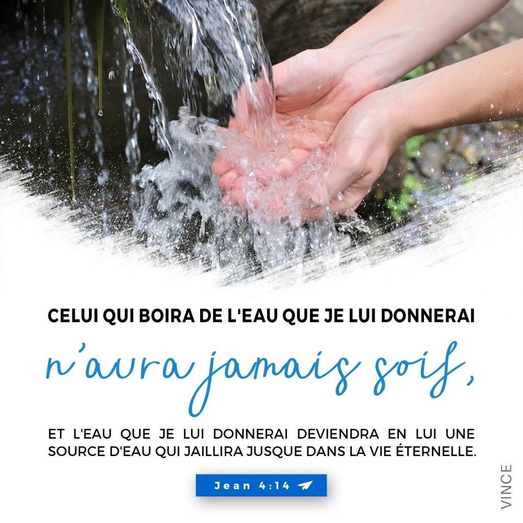 mais celui qui boira de l’eau que moi je lui donnerai n’aura plus jamais soif ; et l’eau que je lui donnerai deviendra en lui une source d’eau jaillissant pour la vie éternelle. »