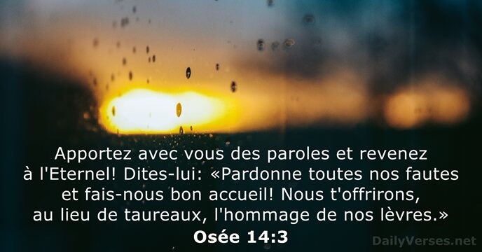 Revenez au Seigneur en lui présentant ces paroles : « Enlève toutes les fautes, et accepte ce qui est bon. Au lieu de taureaux, nous t’offrons en sacrifice les paroles de nos lèvres.