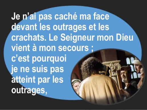 Le Seigneur mon Dieu vient à mon secours ; c’est pourquoi je ne suis pas atteint par les outrages, c’est pourquoi j’ai rendu ma face dure comme pierre : je sais que je ne serai pas confondu.