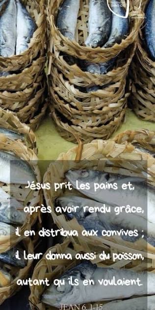 Alors Jésus prit les pains et, après avoir rendu grâce, il les distribua aux convives ; il leur donna aussi du poisson, autant qu’ils en voulaient.