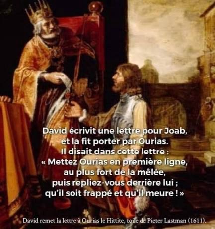 Alors David expédia ce message à Joab : « Envoie-moi Ourias le Hittite. » Et Joab l’envoya à David.