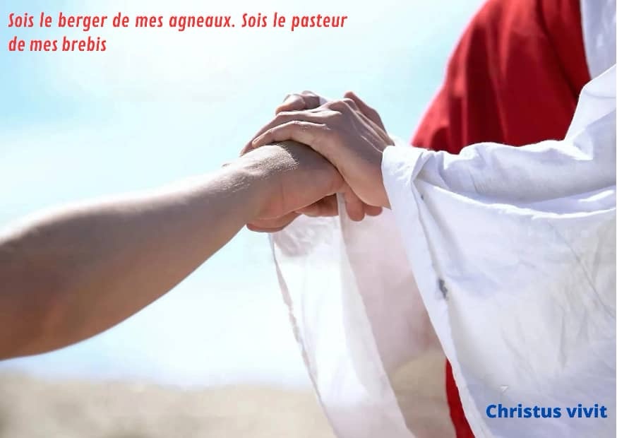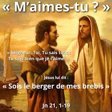 Jésus lui dit : « Sois le berger de mes agneaux. » Il lui dit une deuxième fois : « Simon, fils de Jean, m’aimes-tu vraiment ? » Il lui répond : « Oui, Seigneur ! Toi, tu le sais : je t’aime. » Jésus lui dit : « Sois le pasteur de mes brebis. » Il lui dit, pour la troisième fois : « Simon, fils de Jean, m’aimes-tu ? » Pierre fut peiné parce que, la troisième fois, Jésus lui demandait : « M’aimes-tu ? » Il lui répond : « Seigneur, toi, tu sais tout : tu sais bien que je t’aime. » Jésus lui dit : « Sois le berger de mes brebis.