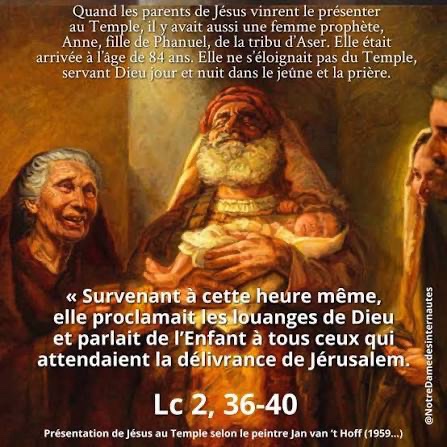 demeurée veuve, elle était arrivée à l’âge de quatre-vingt-quatre ans. Elle ne s’éloignait pas du Temple, servant Dieu jour et nuit dans le jeûne et la prière.