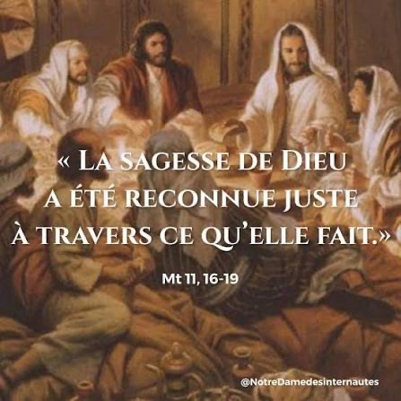 Le Fils de l’homme est venu ; il mange et il boit, et l’on dit : “Voilà un glouton et un ivrogne, un ami des publicains et des pécheurs.” Mais la sagesse de Dieu a été reconnue juste à travers ce qu’elle fait. »