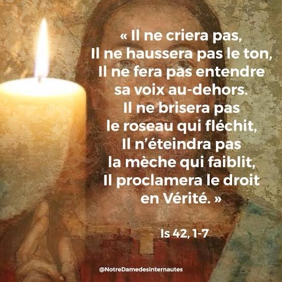 Il ne brisera pas le roseau qui fléchit, il n’éteindra pas la mèche qui faiblit, il proclamera le droit en vérité.