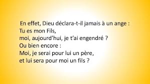 En effet, Dieu déclara-t-il jamais à un ange : Tu es mon Fils, moi, aujourd’hui, je t’ai engendré ? Ou bien encore : Moi, je serai pour lui un père, et lui sera pour moi un fils ?